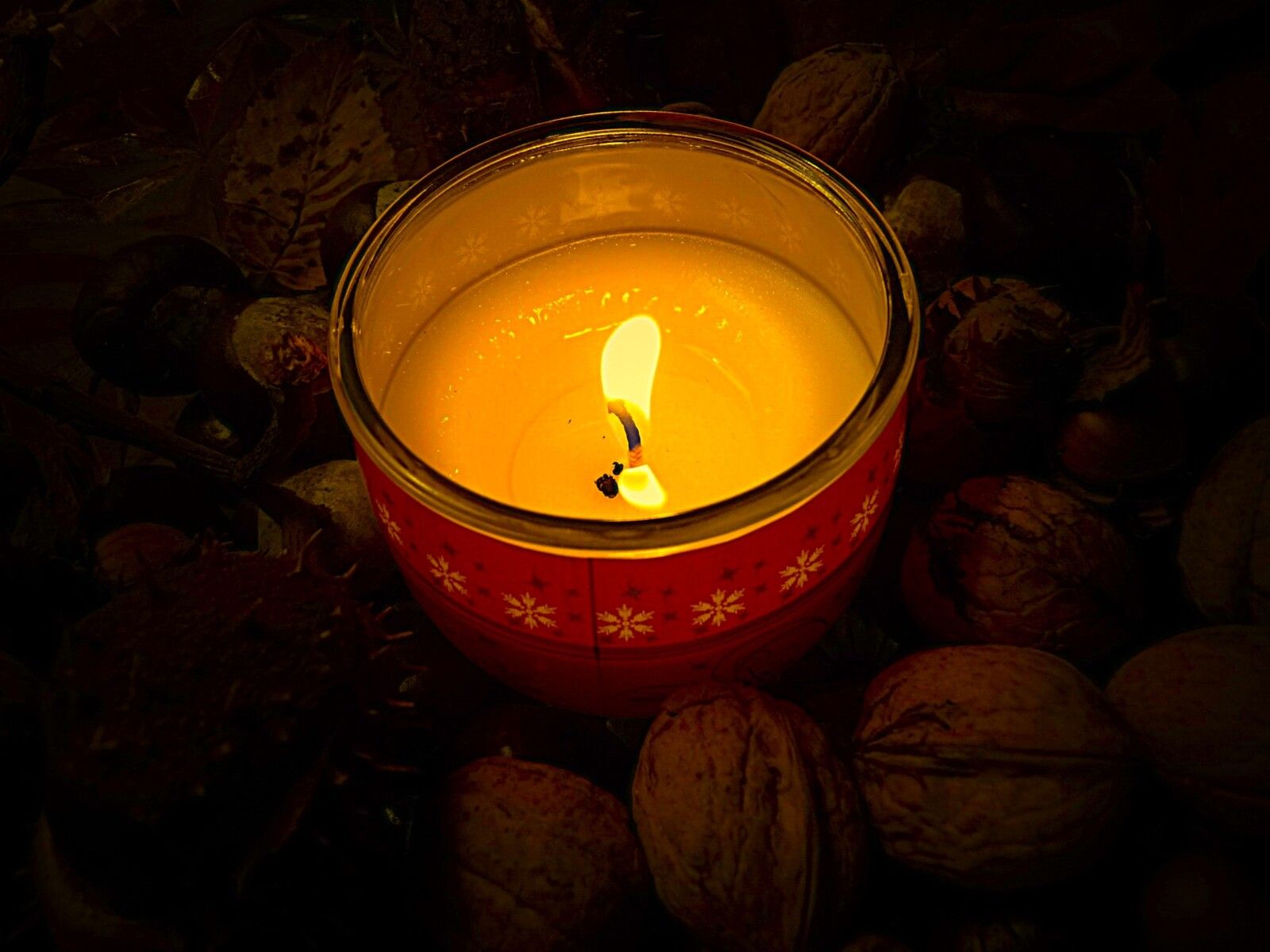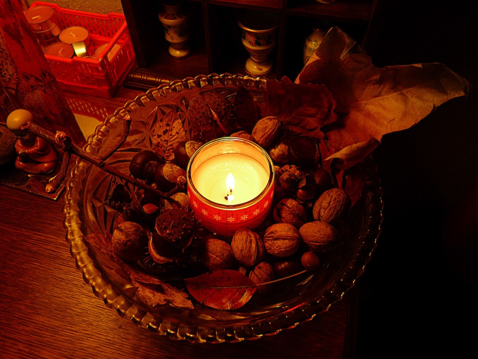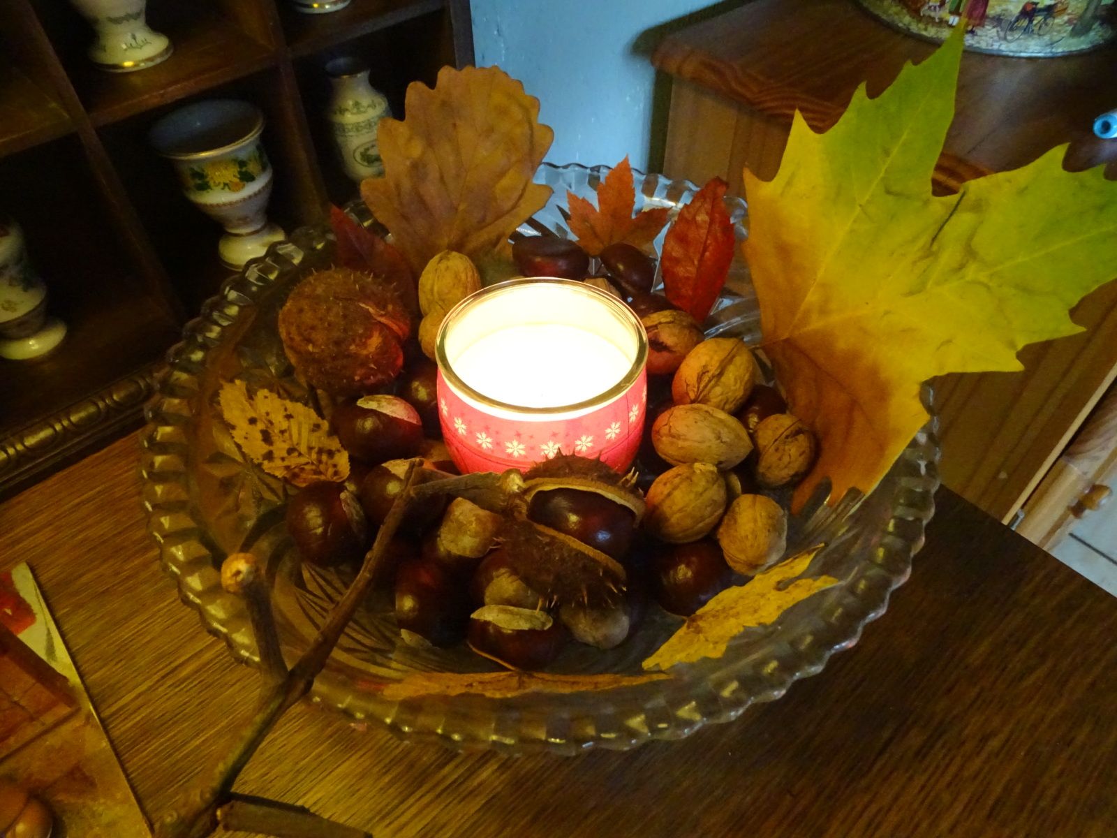 Décoration d'automne, marrons, glands, noisettes, noix et jolies feuilles colorées.