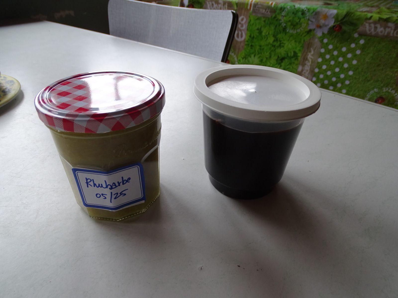 J'ai aussi reçus de mon propriétaire un pot de confiture de rhubarbe et un pot de sirop de Liège, fait avec ses pommes!