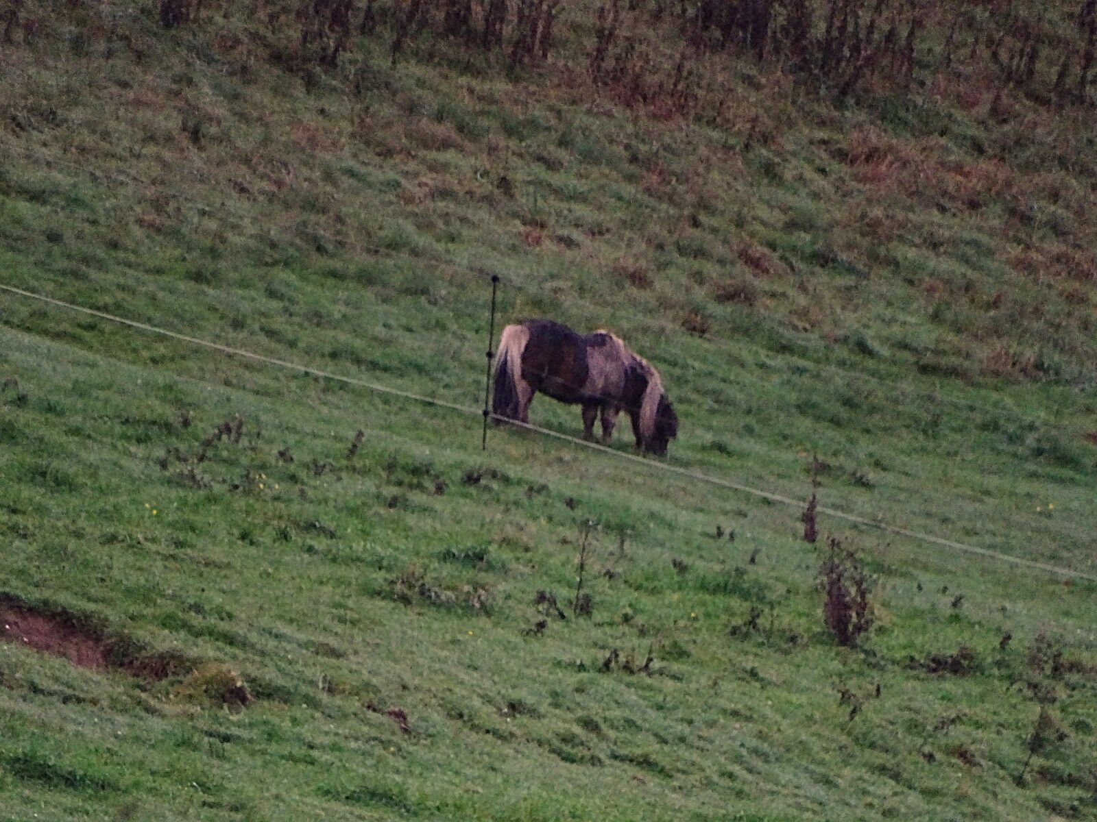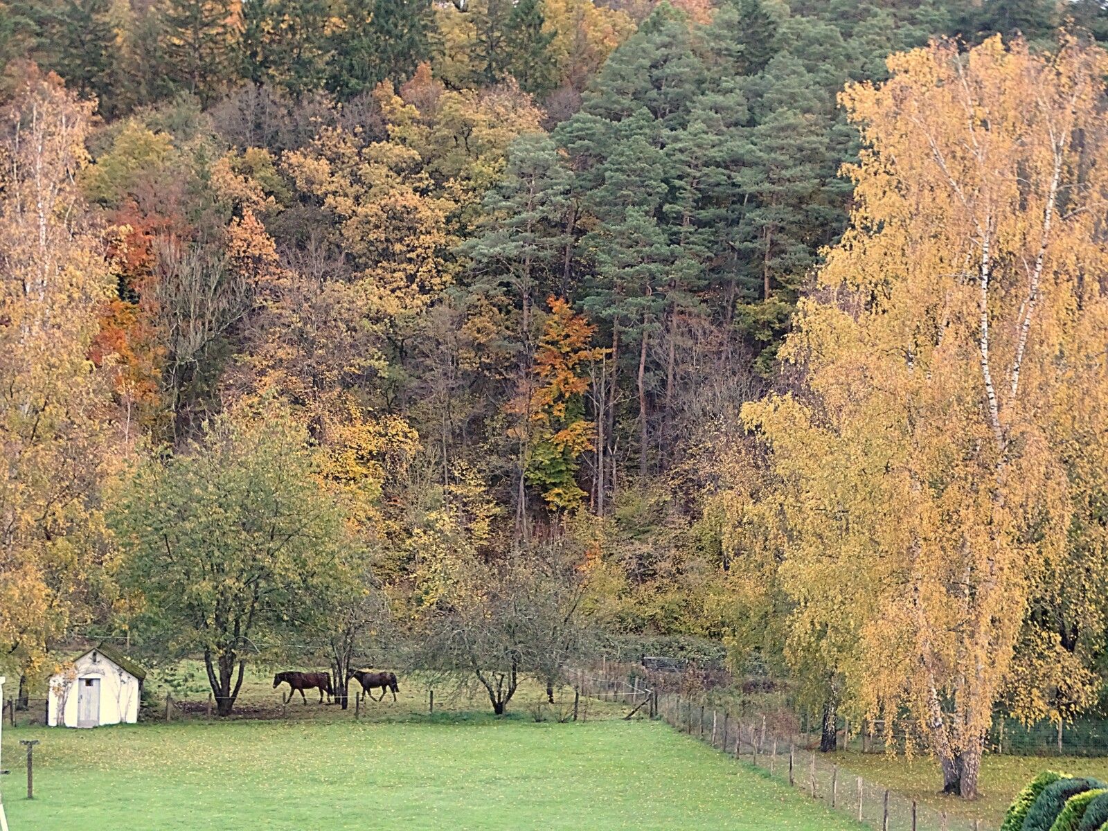 Par la fenêtre d'en haut côté jardin vue sur les champs et les bois et un beau petit cheval!