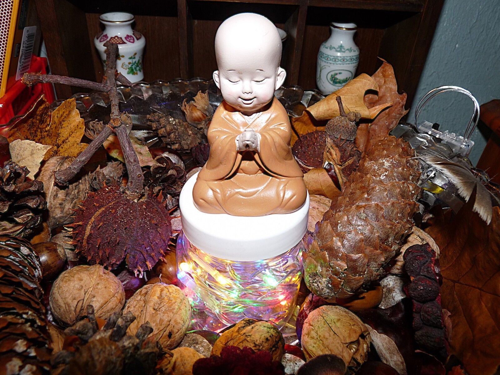 Bouddha avec des petites lumières, trône au centre du pot pourris