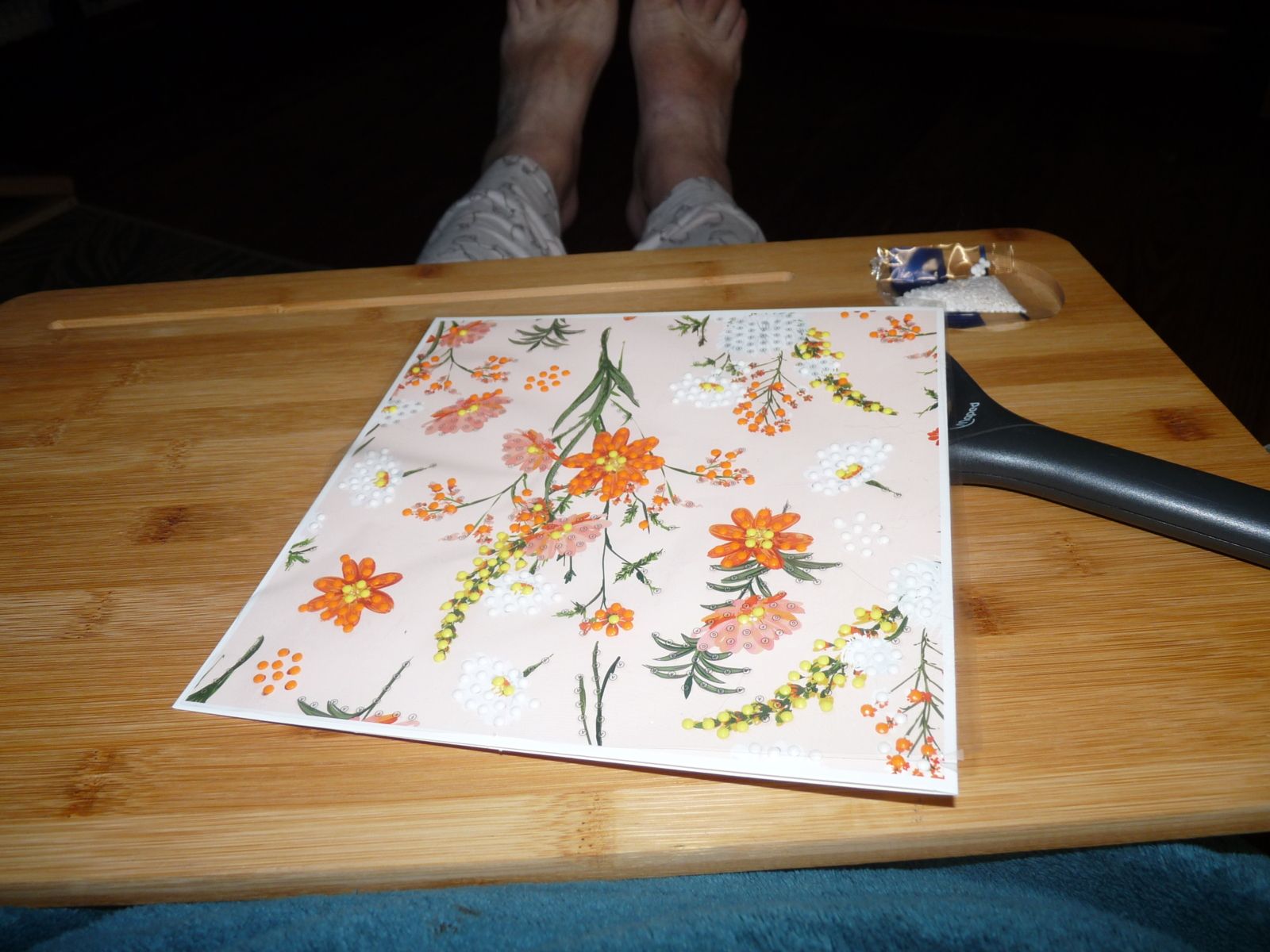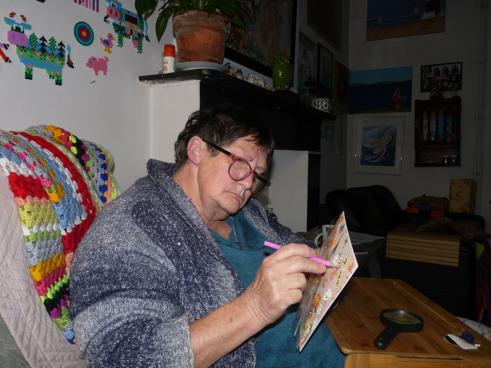 Bien installée dans mon fauteuil je fais une carte anniversaire en peinture diamants.